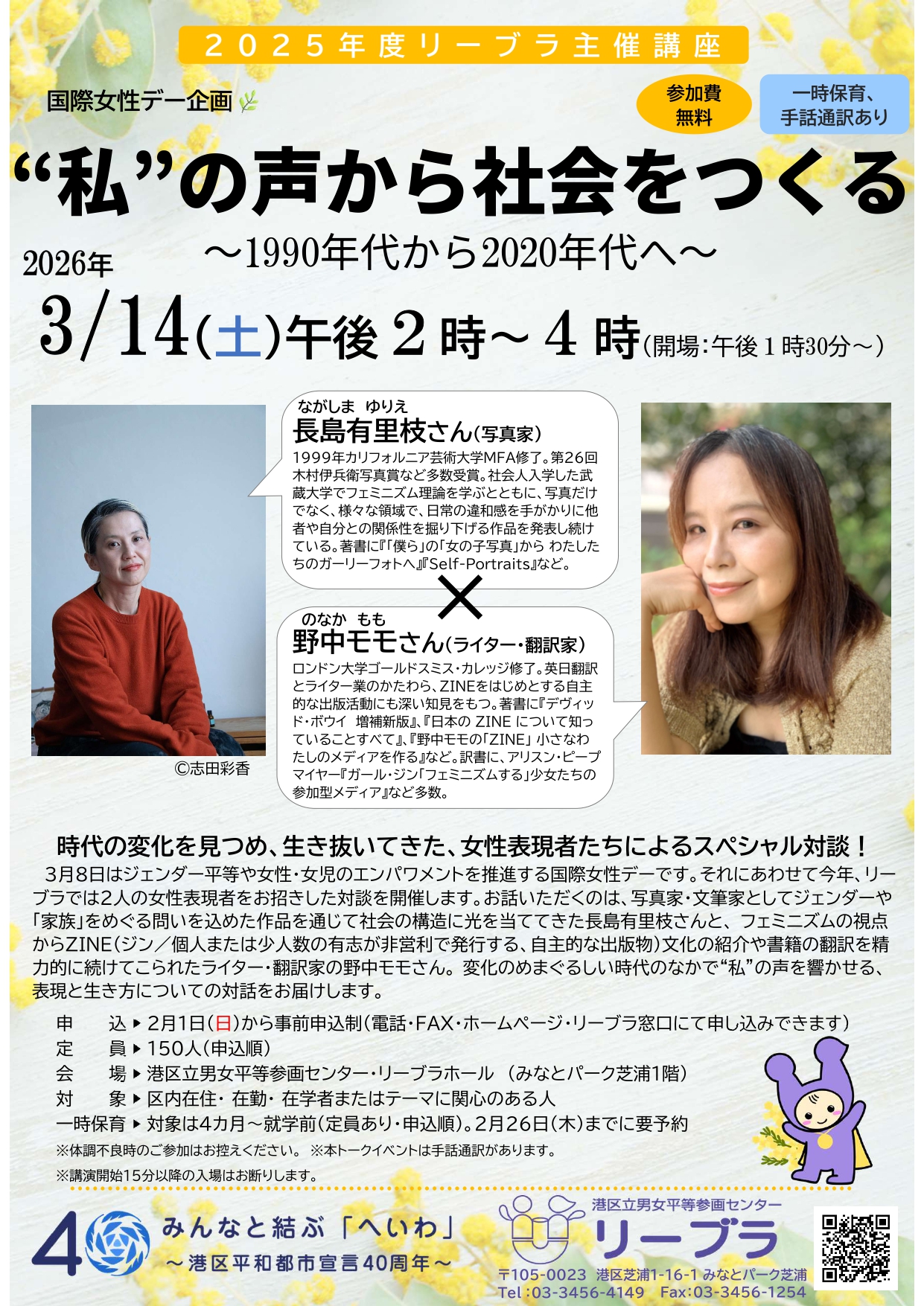 3月8日はジェンダー平等や女性・女児のエンパワメントを推進する国際女性デーです。それにあわせて今年、リーブラでは2人の女性表現者をお招きした対談を開催します。お話いただくのは、写真家・文筆家としてジェンダーや「家族」をめぐる問いを込めた作品を通じて社会の構造に光を当ててきた長島有里枝さんと、 フェミニズムの視点からZINE(ジン/個人または少人数の有志が非営利で発行する、自主的な出版物)文化の紹介や書籍の翻訳を精力的に続けてこられたライター・翻訳家の野中モモさん。 変化のめまぐるしい時代のなかで“私”の声を響かせる、表現と生き方についての対話をお届けします。