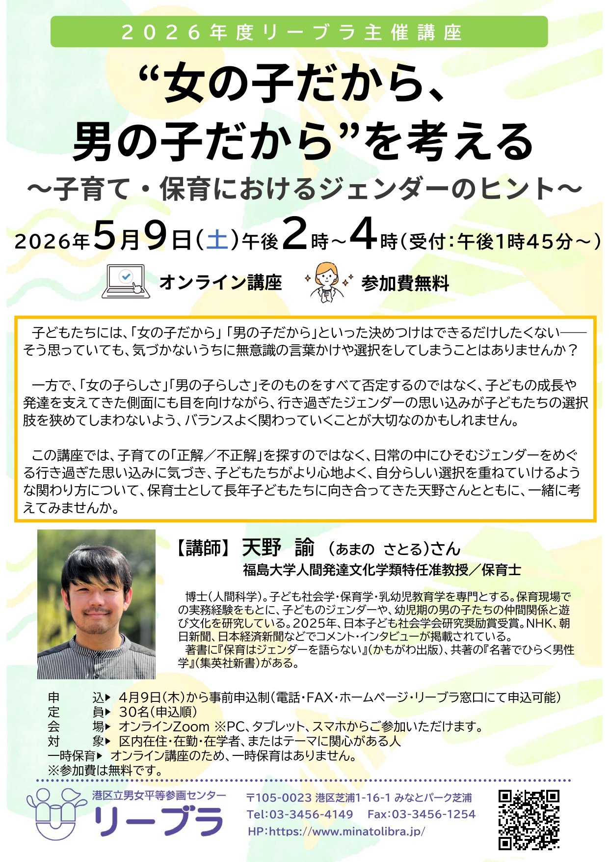 この講座では、子育ての「正解/不正解」を探すのではなく、日常の中にひそむジェンダーをめぐる行き過ぎた思い込みに気づき、子どもたちがより心地よく、自分らしい選択を重ねていけるような関わり方について、保育士として長年子どもたちに向き合ってきた天野さんとともに、一緒に考えてみませんか。